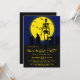 This scary and cool Halloween party invitation is perfect for the creepy and spooky event. It features illustrations of a black skeleton carrying a jack o' lantern candy bucket walking on along a dark path at a graveyard with bats flying and a black cat sitting on top of a tombstone. The giant yellow glowing moon is rising as the sky turns a dark midnight blue. It's the perfect design to creep out your guests before the night even begins!