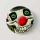 An illustration of a scary skull clown face with red nose and weird green eyes looking at you.