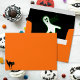 Create your own custom, personalised, fun, creepy spooky black cat, cute scary ghost, black flying witch on broom halloween orange black and white, family name return address, smooth, classic, matte, birthday / costume / office party invitation / wedding invitation / greeting card / mail envelopes. Simply enter your name / family name / company name, and address. Perfect for both, home and business, adults and kids, personal and official mailings. Great return address envelopes for mailings for scary spooky zombie haunted halloween theme birthday party, costume party, office party, wedding, baby shower, and more.