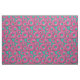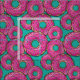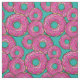 A fun and adorable fabric featuring scattered pink doughnuts of various sizes on a turquoise backdrop.