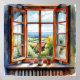 Watercolor artwork depicting a scenic countryside with hills viewed through a sunlit open window featuring potted plants.