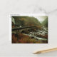 A postcard with a nature photograph. Moody and beautiful landscape. A secluded stone bridge beside a lively river with waterfalls, forest and mountains surrounding the area.