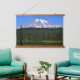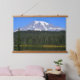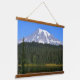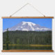 Decorate your living space with this horizontal, hanging wall tapestry with wooden tops that features a scenic, landscape photo image of snow capped Mount Rainier and a mountain lake in the Pacific Northwest state of Washington.