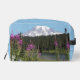 Zippered dopp kit toiletry bag that features a scenic photo image of snow capped Mount Rainier and pink Fireweed wildflowers growing along the shore of a lake along with a solid, light blue top and sides. Perfect accessory bag for your toiletries for on-the-go travel!