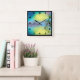 A pastel coloured scenic landscape with mountains in the back and a turquoise lake glowing yellow from the suns reflection