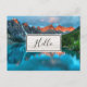 A hello postcard with a beautiful photograph featuring a beautiful mountain range, grey and rust colours. A green lush forest surrounds a calm clear lake. Gorgeous outdoorsy image.