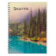 A spiral notebook with a scenic northern landscape photograph as the backdrop. A turquoise coloured lake with a forest of pine trees in the background and a foggy misty sky giving it a magical mystical quality. Personalise with a name or other text.