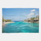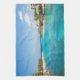 A kitchen towel with a beautiful photo featuring a tropical beach resort.