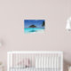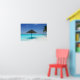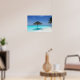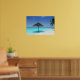 A poster with a photograph of a scenic tropical beach in The Maldives. A white sandy beach and crystal blue waters with a solo thatched umbrella. Secluded and serene.