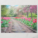 Scenic Spring themed photograph features a garden path lined with beautiful pink tulips with pink, green and white flowering trees in the distant. A perfect backdrop for your vacation photos and mementos