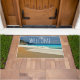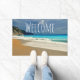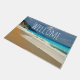 Welcome doormat with a beautiful photograph featuring a turquoise blue sea and a sandy beach with waves of foamy surf.
