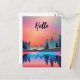 A postcard with a beautiful graphic design featuring a peaceful lake with deer. and tall pine trees being reflected in the water. Stars hover overhead.