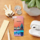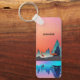 A key chain with a beautiful graphic design featuring a peaceful lake with deer. and tall pine trees being reflected in the water. Stars hover overhead.