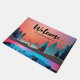 Welcome door mat with a beautiful graphic design featuring a peaceful lake with deer. and tall pine trees being reflected in the water.  Stars hover overhead.