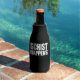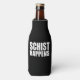 This geology-themed bottle sleeve features the classic, corny phrase "Schist Happens," a pun variation on another common saying. The design is in bold, white block letters on a black background. There are two lines of text on the back, where you can add your own name or short message, so nobody will take your drink!