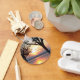 Ein Sonnenuntergang am See, in dem sich die orange Sonne spiegelt, ist auf diesem Schlüsselanhänger zu sehen.