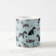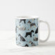 Cute Schnauzer dogs in black, salt and pepper and black and silver coats sit, stand and rollover with scattered dog bones and paw prints on a light blue background.