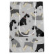Cute Schnauzer dogs in black, salt and pepper and black and silver coats sit, stand and rollover with scattered dog bones and paw prints on a light grey background.