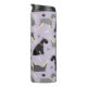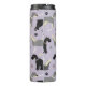 Cute Schnauzer dogs in black, salt and pepper and black and silver coats sit, stand and rollover with scattered dog bones and paw prints on a light purple background.