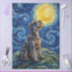A schnauzer sitting beneath a swirling star-filled sky, gazing up at a glowing moon, inspired by classic post-impressionist movement with rich color.