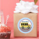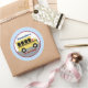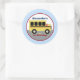 Yellow school bus design. This cute round sticker is customised with your own 2-lines of text.