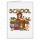 Cute and colourful School Giraffe design T-shirts, sweatshirts, hoodies, mus, cards, stickers, tote bags, and more featuring three giraffes with school supplies and lunches, a red school house, and giraffe style text.