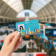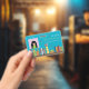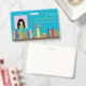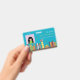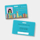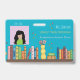 Fun teal photo ID badge for librarian media technician (or any other school staff ) , featuring a watercolor bookshelf illustration . Personalise it with the employee's info and photo . There is a spot in the back for the signature of the card holder or for a barcode sticker .