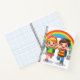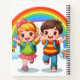 "Colourful notebook featuring a cute cartoon boy and girl running under a bright rainbow with smiling suns, butterflies, and fluffy clouds – perfect for kids and school use."