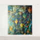 Abstract painting of a variety of fish swimming in a stylised reef environment in vibrant colours.