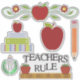 All purpose school teacher themed sticker set sheet with graphics of red apples, stacked books, pencil, ruler and education symbol. Black graphic text, with the ruler, reads Teachers Rule.