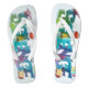 A pair of white flip-flops with a colourful, cartoonish design on the soles. The design appears to be a stack of stylised letters with the word Science in shades of green, blue, and purple, with additional elements like a graduation cap, beakers, and books incorporated into the design. The straps of the flip-flops are white and made of a textured material. The background is plain white, emphasizing the design on the flip-flops.