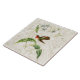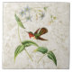 Ceramic tile trivet design features vintage illustration of a Scintillant Hummingbird (Selasphorus scintilla.) Green and brown hummingbird with a red throat perches on a tweedia (Apocynaceae) flowering plant with light blue blossoms, on a light gold marble pattern background.