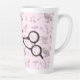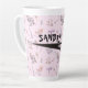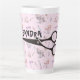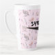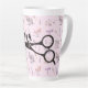 Tall latte mug for a hairdresser. Pale pink colour with background pattern of tools of the trade. Add a name over the black scissors image. The pattern consists of hair dryers, products, brushes and combs, and other items that a stylist would use.