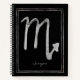 Stylised hammered silver Scorpio astrology zodiac birthday symbol in a hand drawn silver fine double line frame. A hardcover or softcover notebook with your choice of inside pages. Choose from sketchbook, bullet journal, checklist, graph paper, recipe book, or lines in various widths and colours. Customisable. Aquarius text in a fine script on the front cover can be personalised, text can also be added on the back.