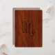 A Scorpio Zodiac Sign applique in a rich brown Mahogany wood grain style print background. A classy modern design for a great custom birthday gift idea.