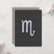 A silver chrome like Scorpio zodiac symbol on a charcoal black carbon fibre texture print decor. A modern urban racy design for a great custom birthday gift idea.
