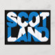 Postcard image of 'SCOTLAND' in bold lettering blended with the flag of St Andrew against black background