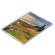 Photograph of a picturesque landscape in Scotland. Colourful rolling hills, large rocky stones and mountains with a brightly lit sky.