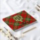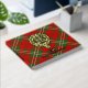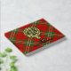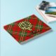 Clan Scott crest badge surrounded by a strap and buckle over red tartan background. Custom front, back and spine text.