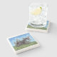 The coasters are gorgeous, a quality feel and heavy weight. They look like a precious archeological find. A rustic stone juxtaposed with a modern floral black and white print. I like the way the print goes slightly imperfect on the cut stone edges giving them a kind-of natural beauty.