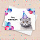 Elevate the joy of a special day with a scottish fold cat birthday card, where a delightful grey cat adorned with a birthday party hat and surrounded by balloons steals the spotlight in a vibrant watercolor illustration. This card captures the essence of a cat who knows how to celebrate in style.