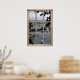 Poster that looks like a window -- fishing boats This window scene shows a harbour in Scotland. The fishing boats are moored in the calm sea water in this traditional harbour which dates back to the 1600s. A rustic wooden window frames the tranquil scene, with the leaves of trees creating an attractive foreground. Beyond you can glimpse the open sea beneath a clouded sky.