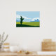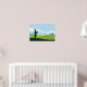 A graphic poster featuring an illustration of a Scottish landscape with a silhouetted man in a kilt playing bagpipes, standing on a hill in the middle of a green field. The background contains a castle and trees and few clouds in the sky. This wall art will be perfect for home or office decoration.
