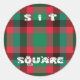 The image features a traditional tartan plaid pattern, a hallmark of Scottish textiles. Superimposed on this rich fabric are the words "SIT" and "SQUARE," arranged vertically. The word "SQUARE" incorporates small cartoonish figures embedded within the letters, adding a whimsical touch. The composition is balanced and focused, emphasizing both the tartan design and the text.