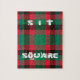 "SIT" and "SQUARE" Text: These words introduce a textual element, creating a unique juxtaposition with the traditional tartan.