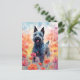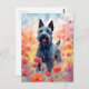 Colourful watercolor artwork of a Scottish Terrier sitting in a field of spring flowers.