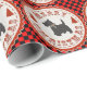 Speciality gift wrap with Scottie dog and Christmas trees on a field of classic black and red chequered board design. Cute puppy designs for holiday animal lovers.