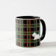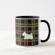 A white scottish terrier stands out against a dark plaid background on this mug. The designs are from original illustrations.