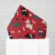 Cute black, grey and wheaten Scottie dogs wearing bows, with pawprints and dog bones on a red background.