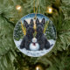 Add a touch of festive charm to your Christmas tree with this delightful ornament, featuring two adorable Scottish Terriers sitting beside a cheerful snowman in a snowy winter scene. As the sun sets behind snow-covered trees, a golden glow fills the sky, creating a magical holiday atmosphere. Perfect for Scottish Terrier lovers, this ornament beautifully captures the warmth and joy of the season, making it a charming addition to your holiday décor. generativecontent